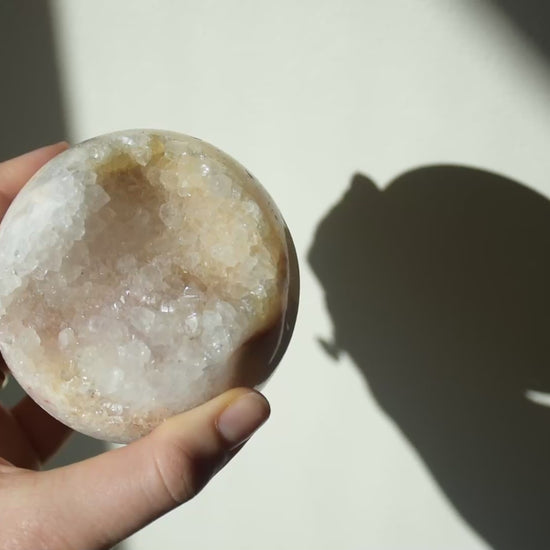 ✧ Storage: This crystal would benefit from a stand that has a round base for the sphere to sit upright and not fall off any high surfaces. It can be placed in any space where you desire emotional healing and inner peace, such as your bedroom or sacred space for meditation.